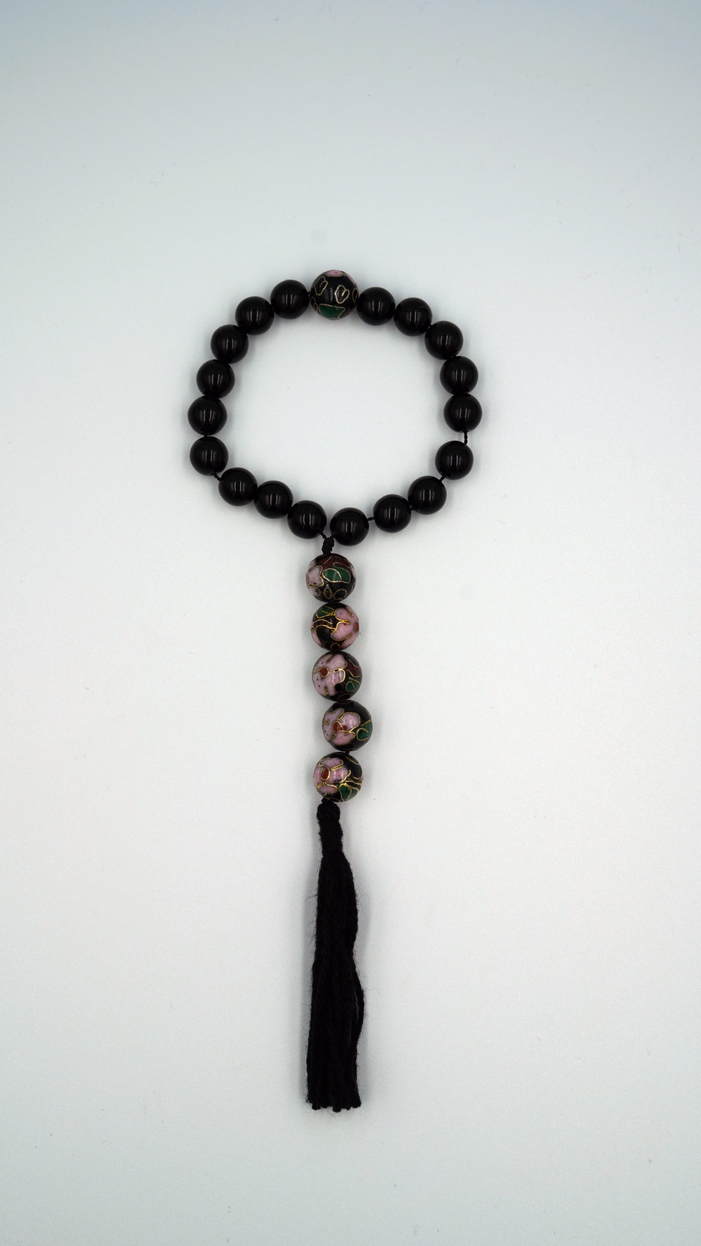 Gebetskette aus 18 tschechischen Glasperlen, schwarz, mit sechs handgefertigten Cloisonné Perlen, handgefertigt.